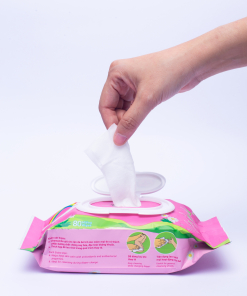 – Dùng tay còn lại đè nhẹ lên nắp khăn, động tác rút khăn dứt khoát.